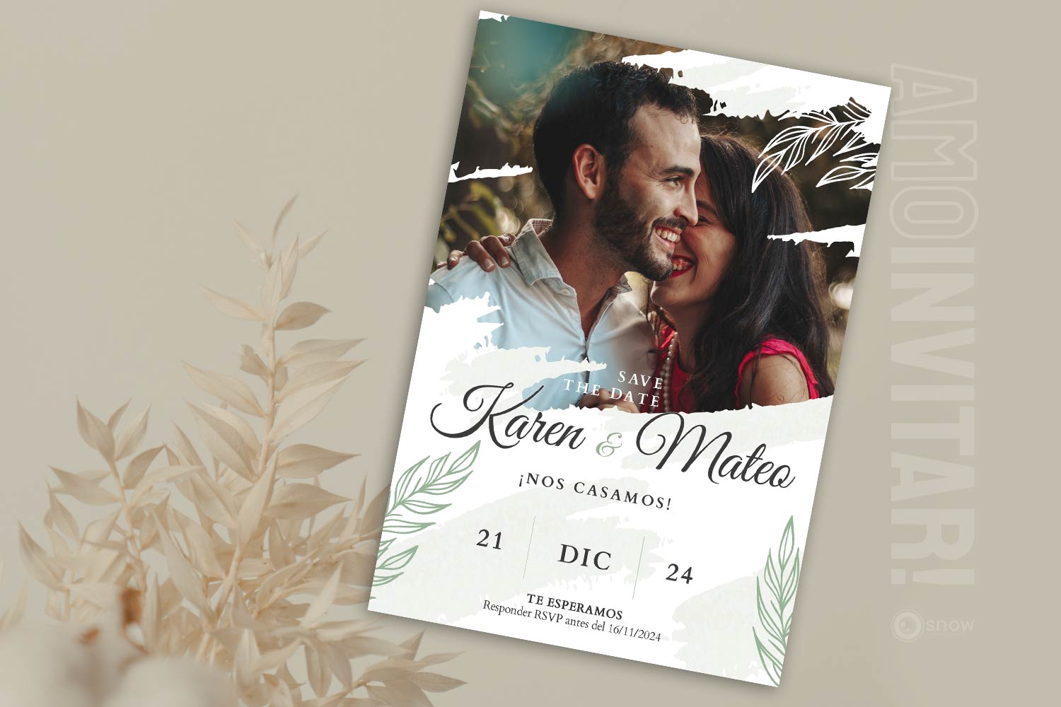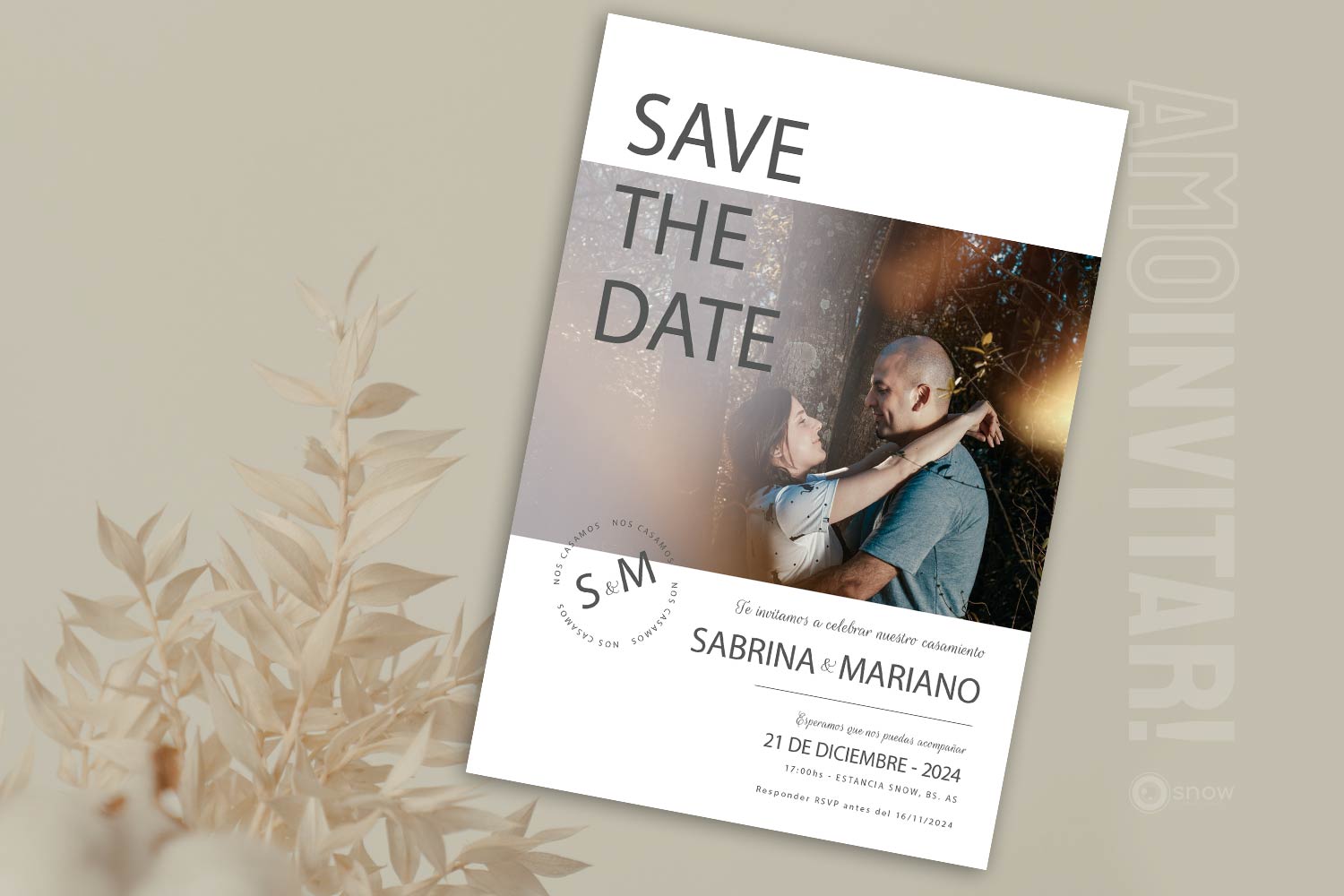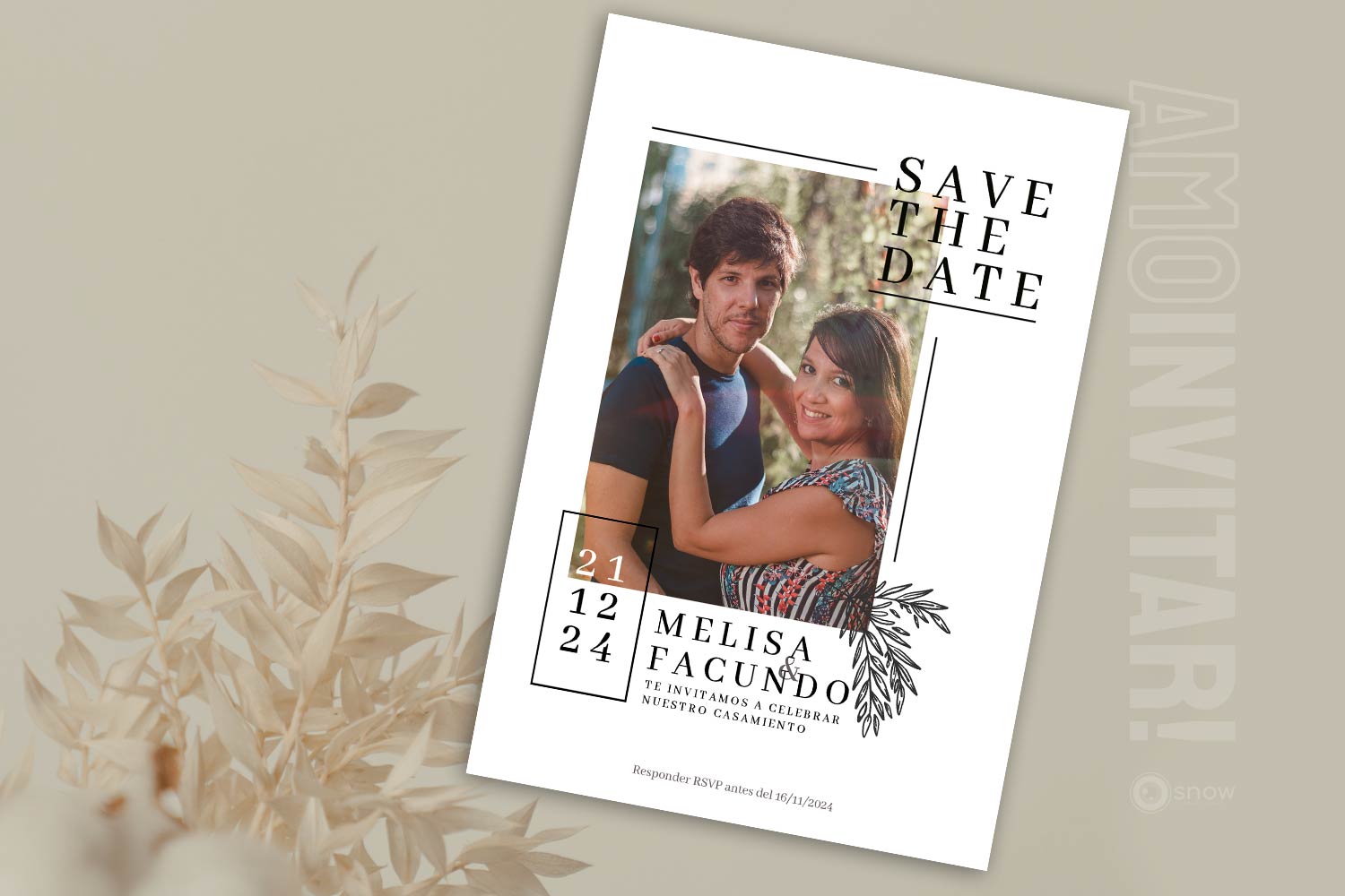 Nuestra Tarjeta Save the Date - Foto es un adelanto para anunciar a los invitados el casamiento, de una forma práctica y elegante, para que vayan agendando la fecha. Incluye una tarjeta con los nombres y la fecha que se puede enviar fácilmente por Whatsapp, email, o por donde prefieras y se puede combinar con todos los modelos de Invitaciones Web interactivas que tenemos.