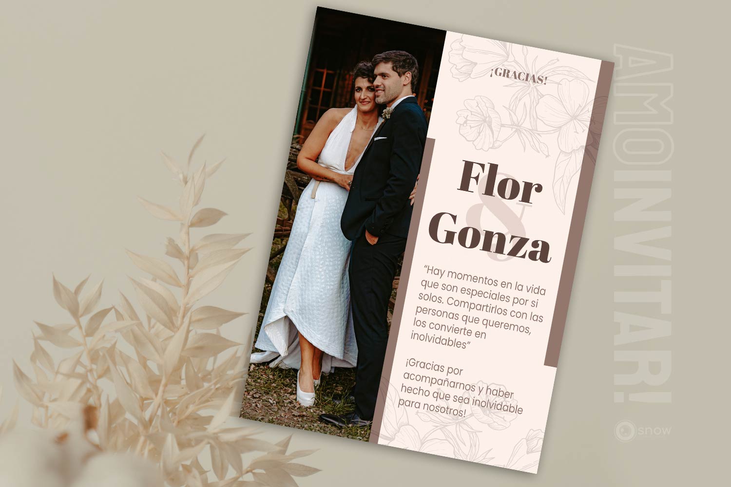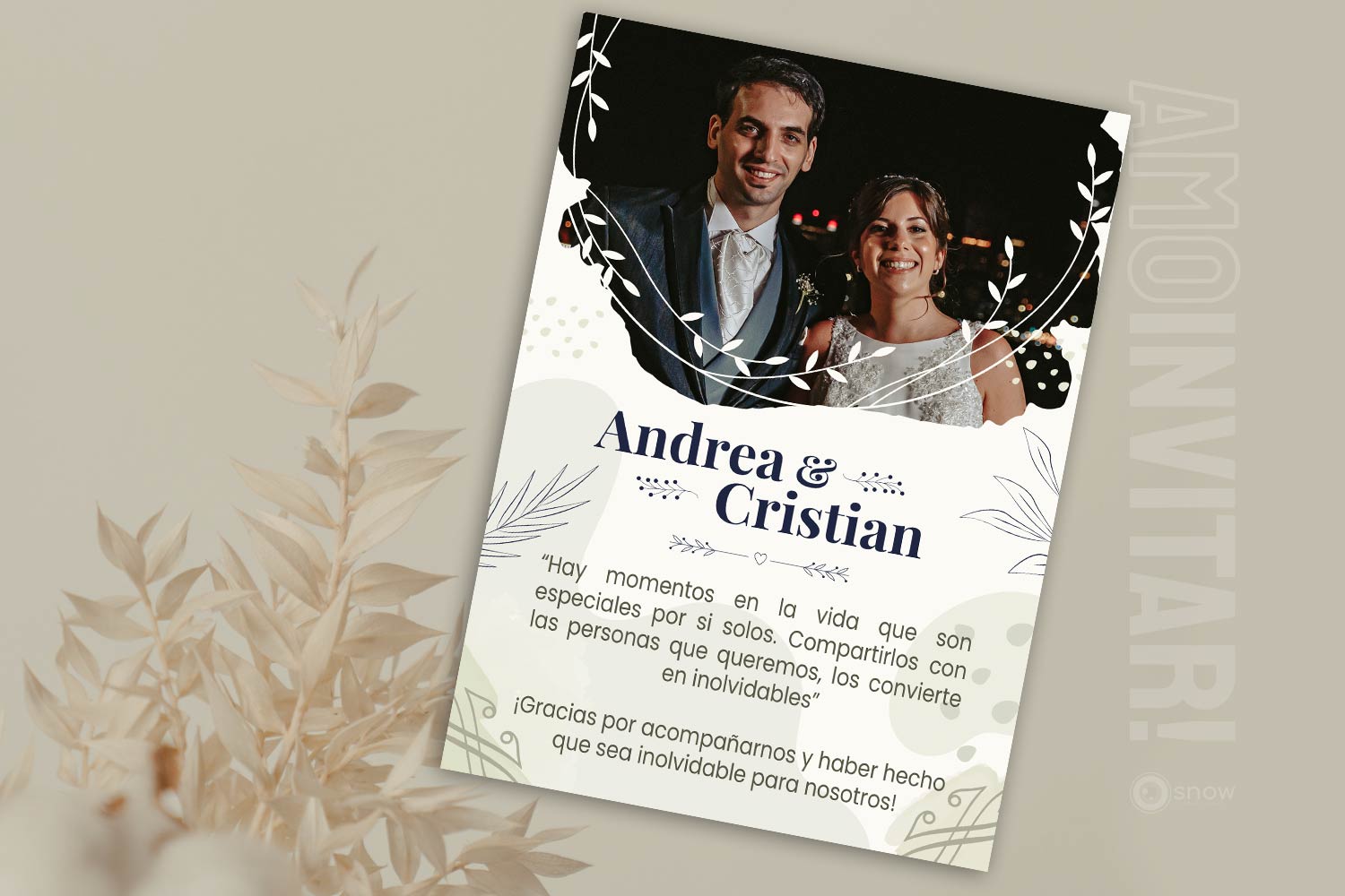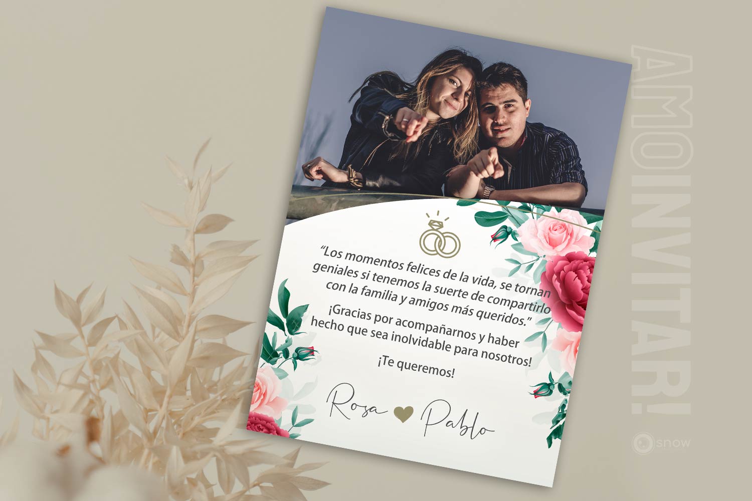 Nuestra Tarjeta de Agradecimiento es la mejor forma de dar las gracias a todos los invitados que participaron del casamiento, de una forma práctica y elegante. Incluye una tarjeta con los nombres y una frase personalizable, que se puede enviar fácilmente por Whatsapp, email, o por donde prefieras y se puede combinar con todos los modelos de Invitaciones Web interactivas que tenemos.